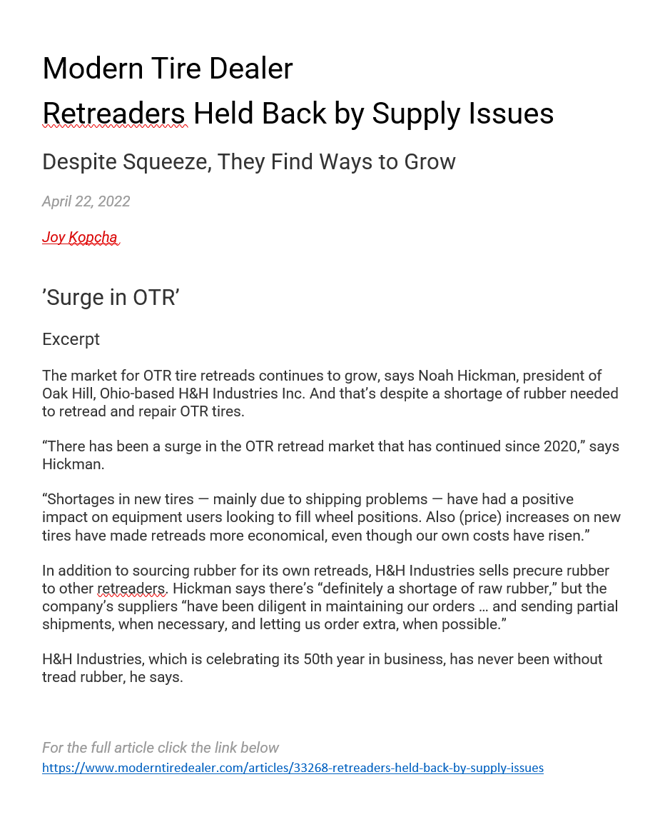 MTD Retreaders Held Back by Supply Issues Noah Hickman2022-06-29T20:32:45+00:00June 29th, 2022| Share This Story, Choose Your Platform! FacebookTwitterRedditLinkedInWhatsAppTumblrPinterestVkEmail