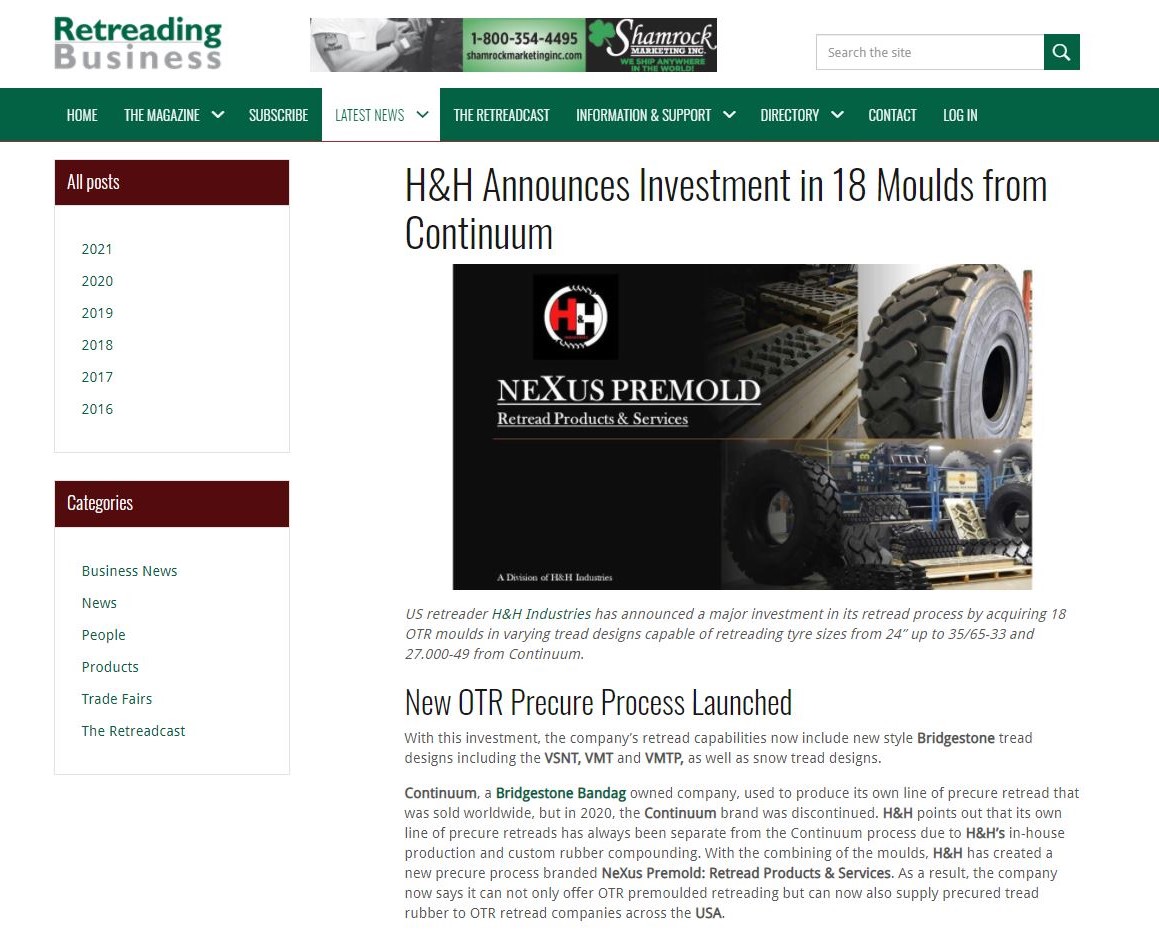 Continuum, a Bridgestone Bandag owned company, used to produce its own line of precure retread that was sold worldwide, but in 2020, the Continuum brand was discontinued. H&H points out that its own line of precure retreads has always been separate from the Continuum process due to H&H’s in-house production and custom rubber compounding. With the combining of the moulds, H&H has created a new precure process branded NeXus Premold: Retread Products & Services. As a result, the company now says it can not only offer OTR premoulded retreading but can now also supply precured tread rubber to OTR retread companies across the USA.