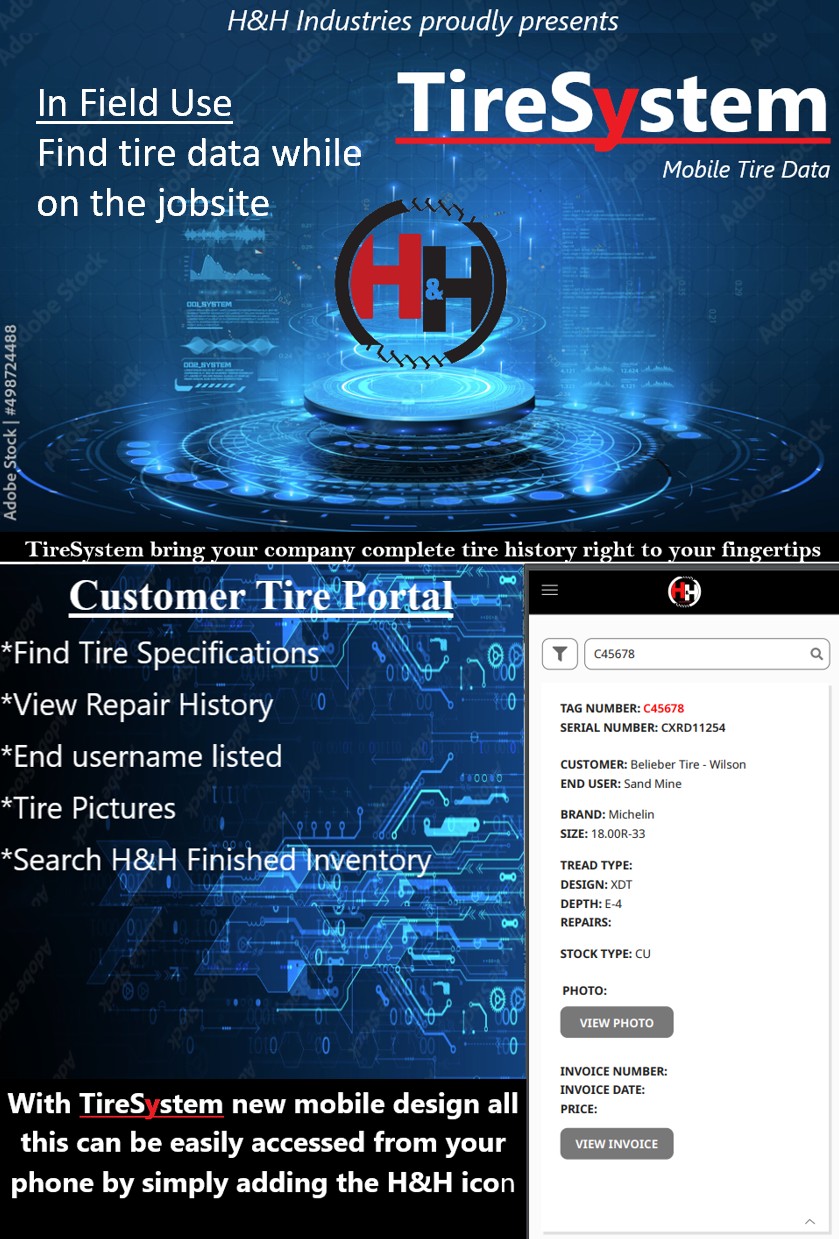 H&H is proud to announce the release of our Mobile Data TireSystem Portal. With this one of a kind system you can look up your companies tire inventory and view individual tire data such as invoices, pictures, repairs, end user names and much, much more – all in real time on your phone while in your office or on the jobsite. You can enter a tires unique tag number and view it’s history with H&H. It provides dates, serial numbers, brands, end user names and if it was a repaired tire or retreaded tire. You can pull invoices up as PDF files to email or print. You also view pictures of each tire. Also, you can view H&H’s finished inventory of used tires and retreaded tires with pictures as well. All you need is a log in provided by H&H. We can show you how to save the website as an icon on your smartphone home page so that all you need to do to access the program is to tap the icon and use facial recognition to log in.